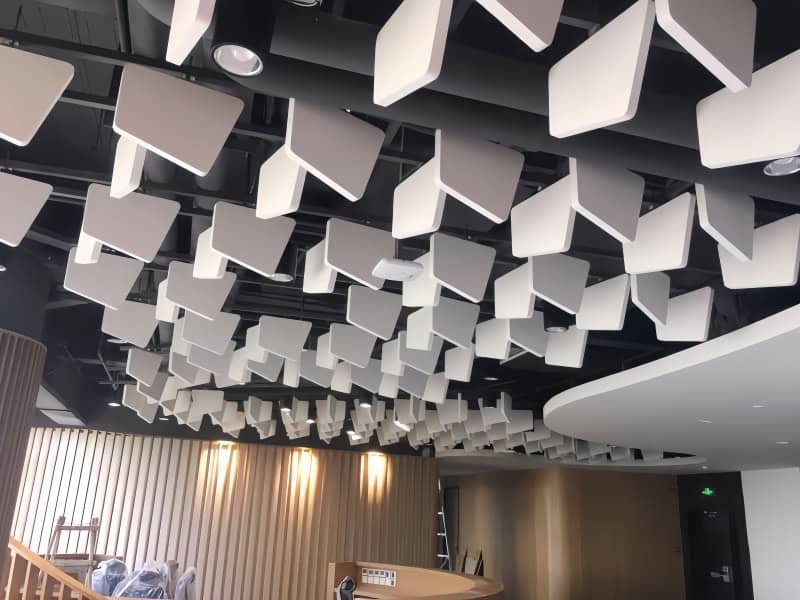 There are two types of acoustic suspension systems: one is acoustic clouds suspended horizontally, and the other is acoustic baffles suspended vertically. The suspension panels utilize glass fiber or rock wool as their core and can be customized to various sizes and shapes after CNC machine processing. They are widely used in auditoriums, concert halls, theaters, studios, recording studios, and other places with high sound insulation requirements.